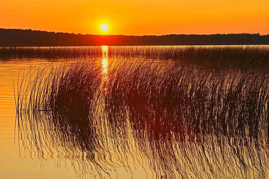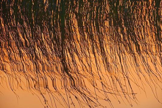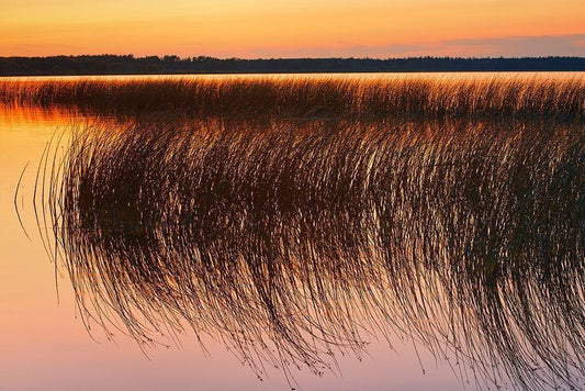 Canada-Manitoba-Riding Mountain National Park Close-up of reeds reflecting in Lake Audy at sunset White Modern Wood Framed Art Print with Double Matting by Jaynes Gallery