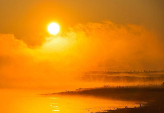 Canada-Manitoba-Riding Mountain National Park Fog rising above Whirlpool Lake at sunrise White Modern Wood Framed Art Print with Double Matting by Jaynes Gallery