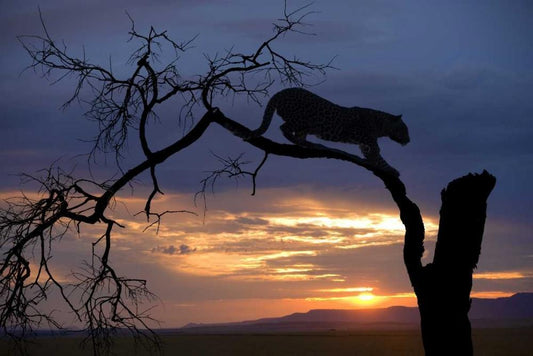 Botswana, Savuti Game Reserve Leopard leaping White Modern Wood Framed Art Print with Double Matting by Zuckerman, Jim