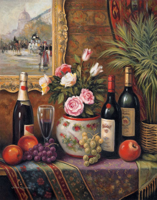 Wine And Floral 1 White Modern Wood Framed Art Print with Double Matting by Zaccheo, John