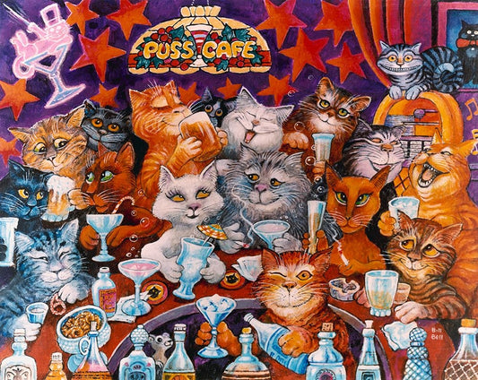 Puss Cafe White Modern Wood Framed Art Print with Double Matting by Bell, Bill