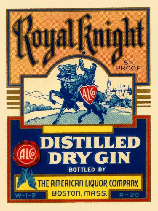 Royal Knight Distilled Dry Gin Black Ornate Wood Framed Art Print with Double Matting by Vintage Booze Labels
