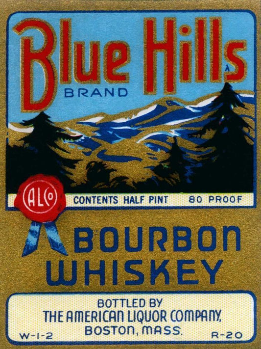 Blue Hills Bourbon Whiskey Black Ornate Wood Framed Art Print with Double Matting by Vintage Booze Labels
