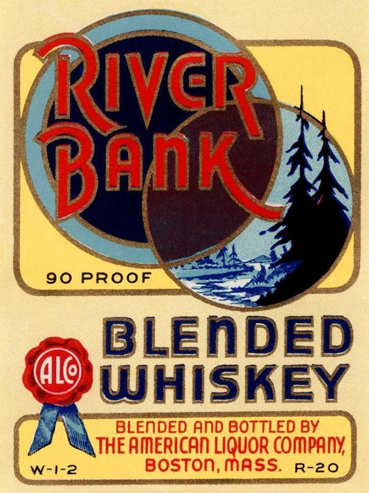 River Bank Blended Whiskey Black Ornate Wood Framed Art Print with Double Matting by Vintage Booze Labels