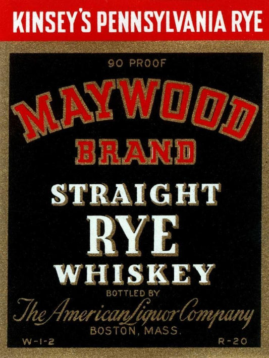 Maywood Brand Straight Rye Whiskey Black Ornate Wood Framed Art Print with Double Matting by Vintage Booze Labels