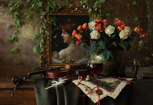 Still Life With Violin And Flowers White Modern Wood Framed Art Print with Double Matting by Morozov, Andrey