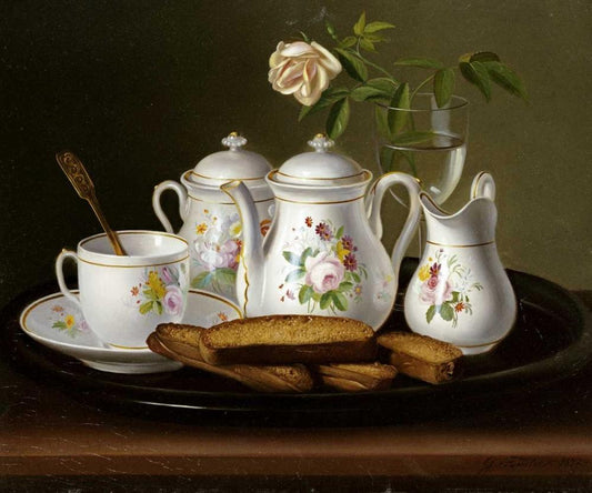 Still Life of Porcelain and Biscuits Black Ornate Wood Framed Art Print with Double Matting by Forster, George