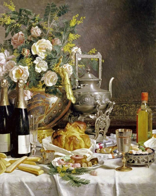 Bottles of Champagne Bread Biscuits and Cakes Black Ornate Wood Framed Art Print with Double Matting by Larcher, Jules