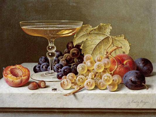 A Glass of Champagne and Grapes Black Ornate Wood Framed Art Print with Double Matting by Preyer, Emilie