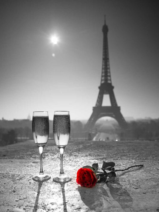 Champagne glasses with red rose next to the Eiffel tower White Modern Wood Framed Art Print with Double Matting by Frank, Assaf