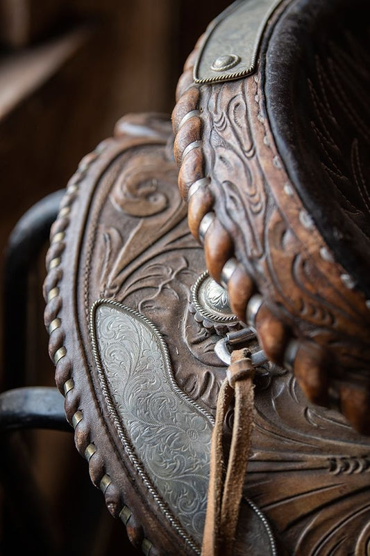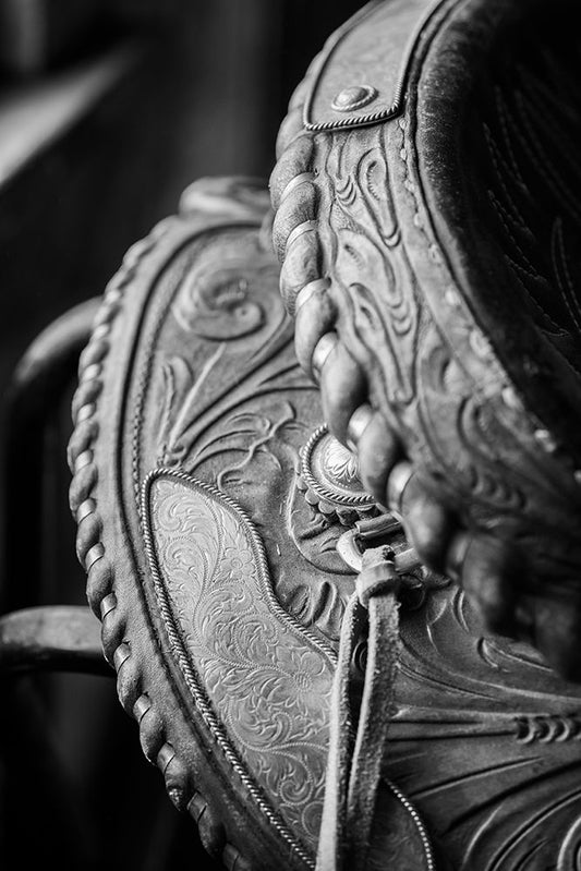 USA-Colorado-Custer County-Westcliffe-Music Meadows Ranch Tack room Tooled leather western saddle White Modern Wood Framed Art Print with Double Matting by Hopkins, Cindy Miller