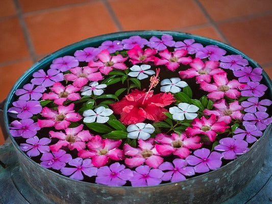 Asia-Vietnam-Mui Ne Red-white-pink-and purple flowers floating in a bowl of water White Modern Wood Framed Art Print with Double Matting by Merrill Images