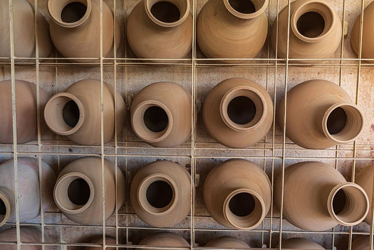 Middle East-Arabian Peninsula-Oman-Ad Dakhiliyah-Bahla-Pots at the Al-Adawi pottery factory in Oman White Modern Wood Framed Art Print with Double Matting by Wilson, Emily M.
