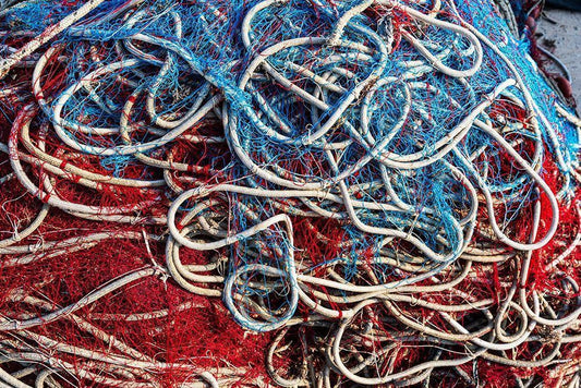 Italy-Apulia-Province of Lecce-Gallipoli Texture detail of fishing nets in red-white-and blue White Modern Wood Framed Art Print with Double Matting by Wilson, Emily
