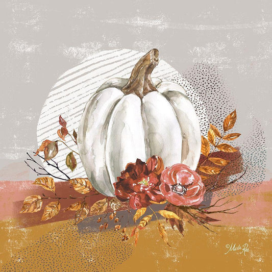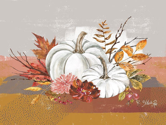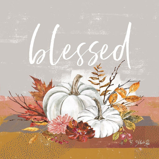 Blessed Pumpkin and Fall Flowers White Modern Wood Framed Art Print with Double Matting by Rae, Marla