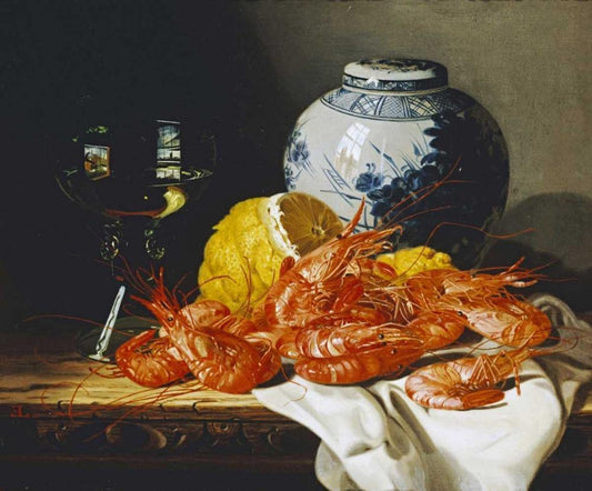 Shrimps, a Peeled Lemon, a Glass of Wine White Modern Wood Framed Art Print with Double Matting by Ladell, Edward