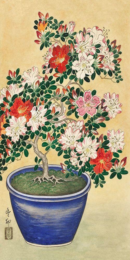 Blooming azalea in blue pot White Modern Wood Framed Art Print with Double Matting by Koson, Ohara