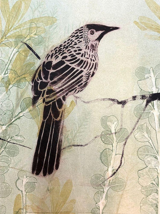 Wattlebird Resting on a Branch White Modern Wood Framed Art Print with Double Matting by Rice, Trudy