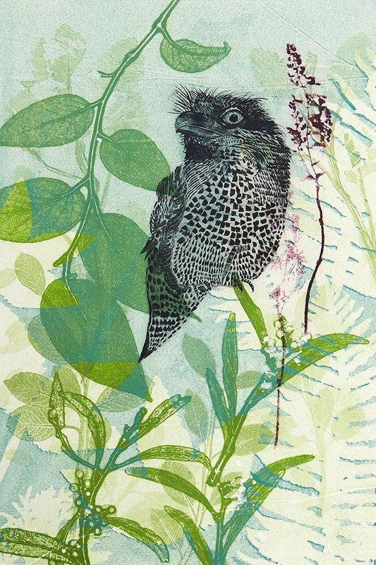 Wattlebird Hiding in the Fernery White Modern Wood Framed Art Print with Double Matting by Rice, Trudy