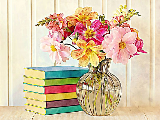 Dahlias and Colorful Books Black Ornate Wood Framed Art Print with Double Matting by Alpenglow Workshop