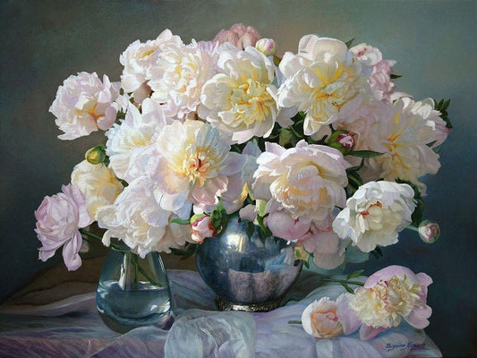 Peonies in Silver Pot I Black Ornate Wood Framed Art Print with Double Matting by Kopania, Zbigniew