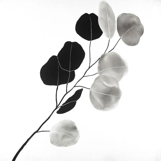 Grayscale Branch with Round Shape Leaves White Modern Wood Framed Art Print with Double Matting by Atelier B Art Studio