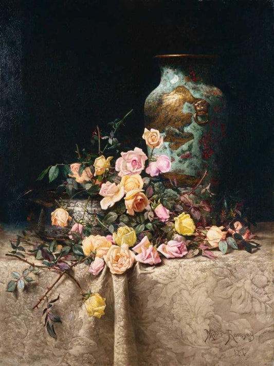 Still Life with Roses Black Ornate Wood Framed Art Print with Double Matting by Ramsey, Milne