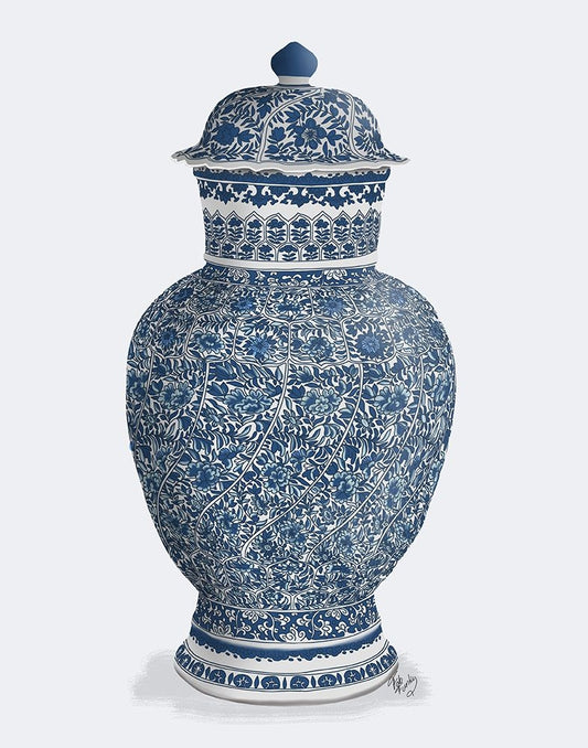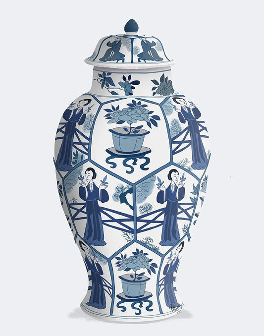 Chinoiserie Vase Leaf Picker Blue Black Ornate Wood Framed Art Print with Double Matting by Fab Funky