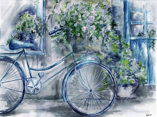 Blue and White Bicycle Florist Shop White Modern Wood Framed Art Print with Double Matting by Tre Sorelle Studios