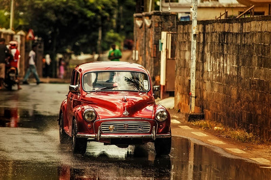 Red Retromobile Morris Minor White Modern Wood Framed Art Print with Double Matting by Jenny Rainbow Fine Art