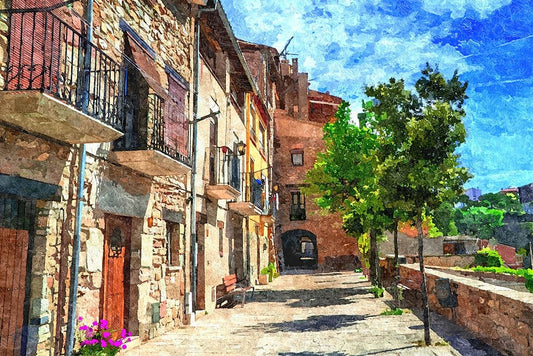 Colorful Village Street Black Ornate Wood Framed Art Print with Double Matting by Alpenglow Workshop