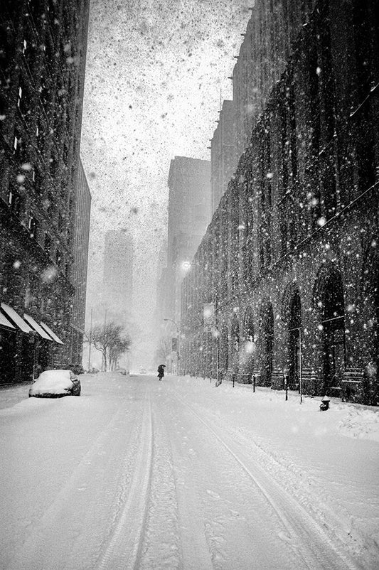 New York Walker in Blizzard - Brooklyn Bridge White Modern Wood Framed Art Print with Double Matting by Froyda, Martin