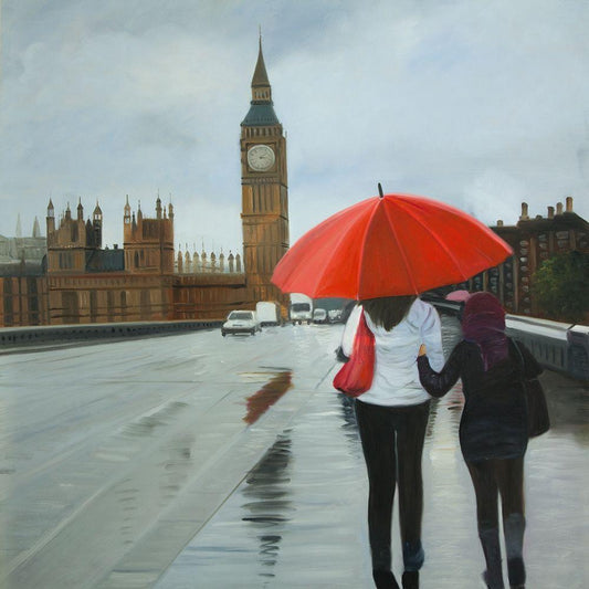 BRITISH UNDER UMBRELLA IN FRONT OF THE BIG BEN Black Modern Wood Framed Art Print by Atelier B Art Studio