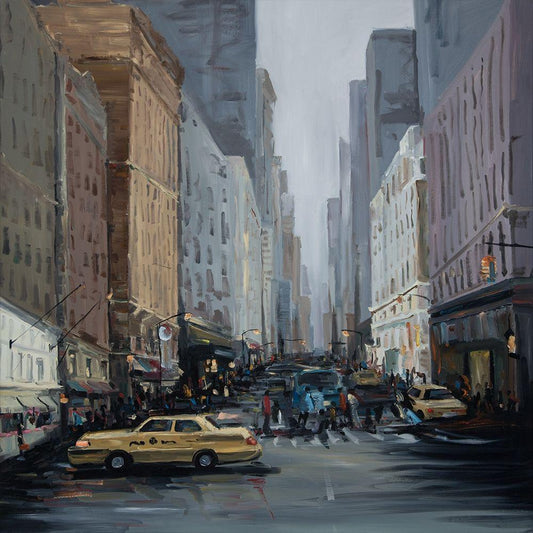 STREET VIEW WITH YELLOW TAXI Black Modern Wood Framed Art Print by Atelier B Art Studio