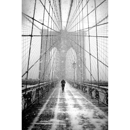 New York Walker in Blizzard - Brooklyn Bridge Black Modern Wood Framed Art Print by Froyda, Martin
