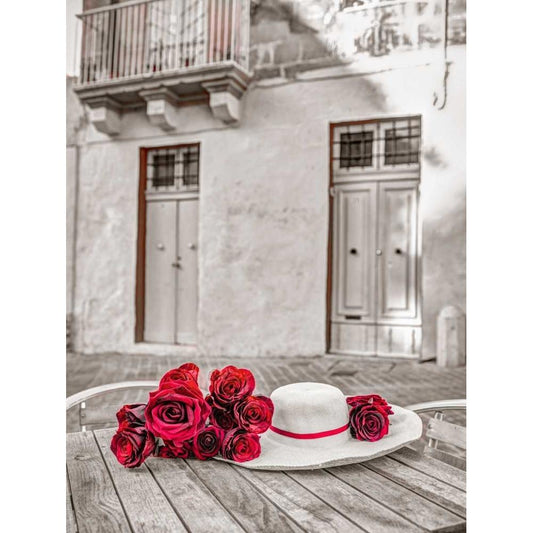 Female hat with bunch of roses on cafe table, Malta Black Modern Wood Framed Art Print by Frank, Assaf