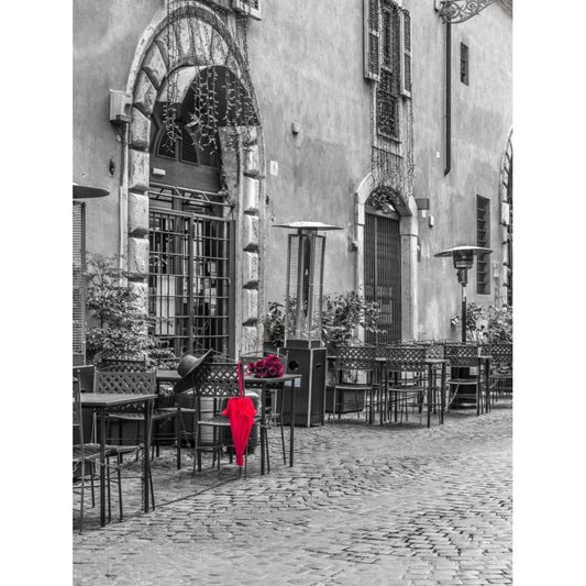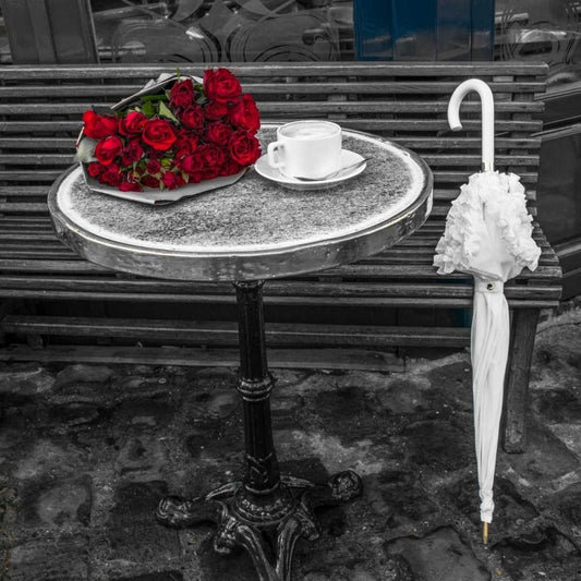 Red umbrella with female hat and bunch of roses on cafe table, Rome, Italy Black Modern Wood Framed Art Print by Frank, Assaf