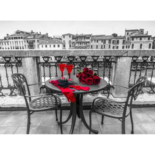 Bunch of Roses with wine glasses and female hand gloves on cafe table, Venice, Italy Black Modern Wood Framed Art Print by Frank, Assaf