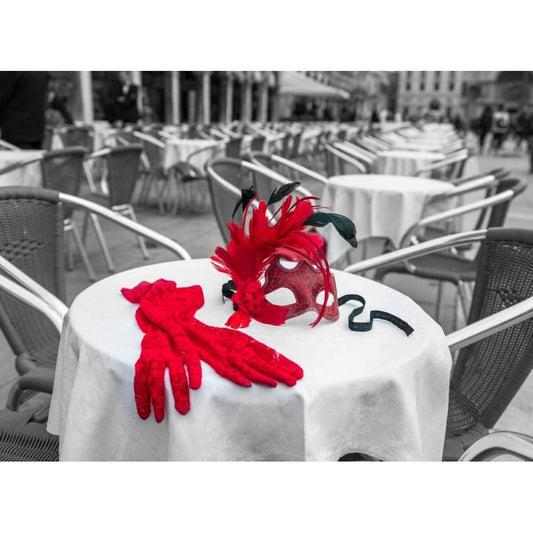 Female hand gloves with Venetian mask on cafe table, Venice, Italy Black Modern Wood Framed Art Print by Frank, Assaf