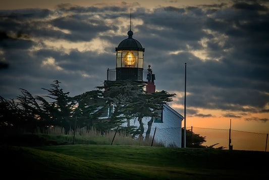 Point Pinos shines its light at sunset. Black Ornate Wood Framed Art Print with Double Matting by Sederquist, Betty