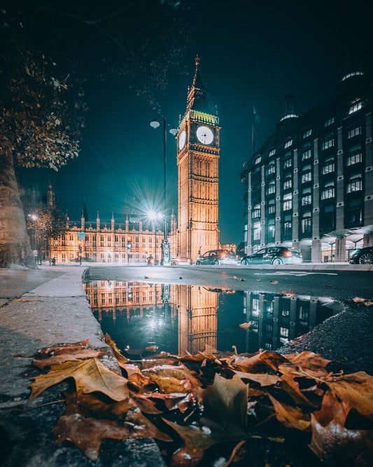 Big Ben Reflection White Modern Wood Framed Art Print with Double Matting by George, David