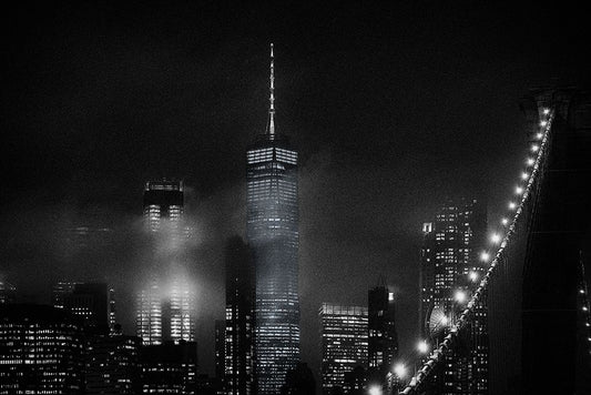 Night Cityscape From The Brooklyn Bridge White Modern Wood Framed Art Print with Double Matting by Ramirez, Carlos