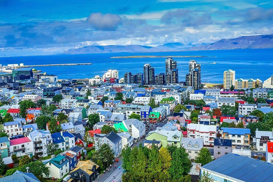 Colorful red green blue Houses Apartment Buildings Cars Bus Streets Ocean-Reykjavik-Iceland White Modern Wood Framed Art Print with Double Matting by Perry, William