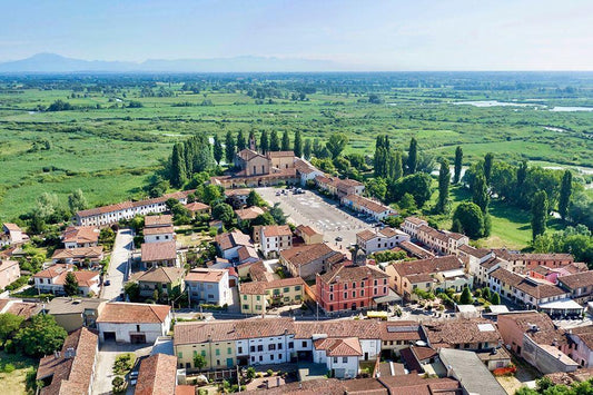Italy-Mantova-Le Grazie village-Basilica and square-Mincio river valley in the background White Modern Wood Framed Art Print with Double Matting by Molinari, Michele