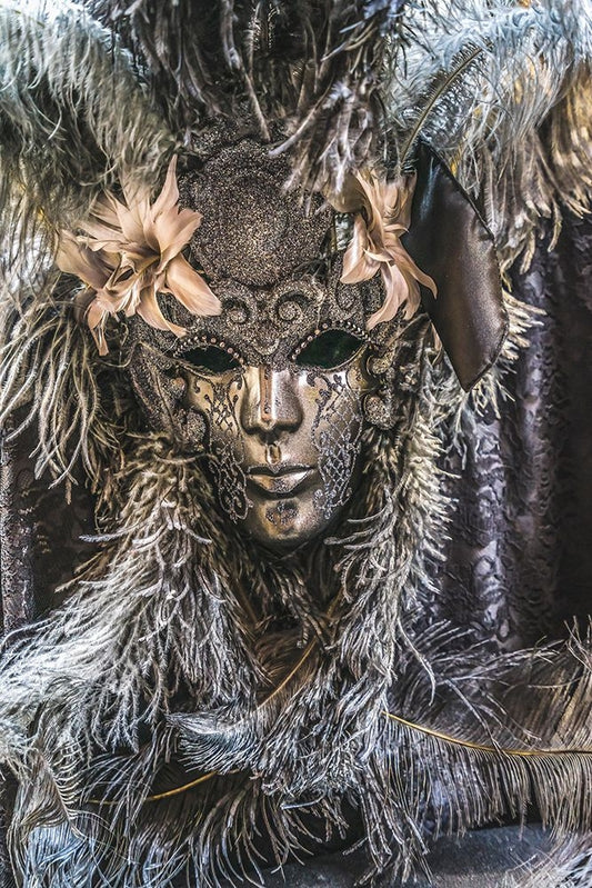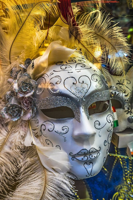 Silver Venetian mask feathers-Venice-Italy-Used since 1200s for Carnival-Also used for Mardi Gras White Modern Wood Framed Art Print with Double Matting by Perry, William