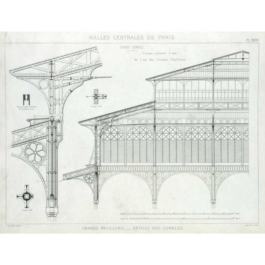 Les Halles, Paris, Grand Pavilion Details Gold Ornate Wood Framed Art Print with Double Matting by Baltard, Victor