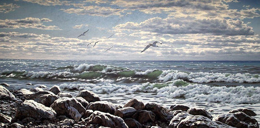 Seagulls White Modern Wood Framed Art Print with Double Matting by Adamov, Alexey