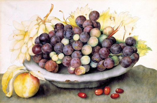 Dish of Grapes and a Peach White Modern Wood Framed Art Print with Double Matting by Garzoni, Giovanna
