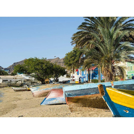 Traditional fishing boats on the beach of the harbor City Mindelo-a seaport Africa White Modern Wood Framed Art Print by Zwick, Martin