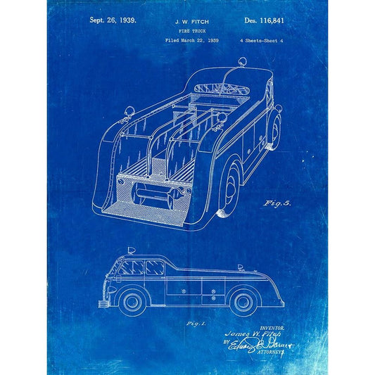 PP462-Faded Blueprint Firetruck 1939 Two Image Patent Poster Black Modern Wood Framed Art Print with Double Matting by Borders, Cole